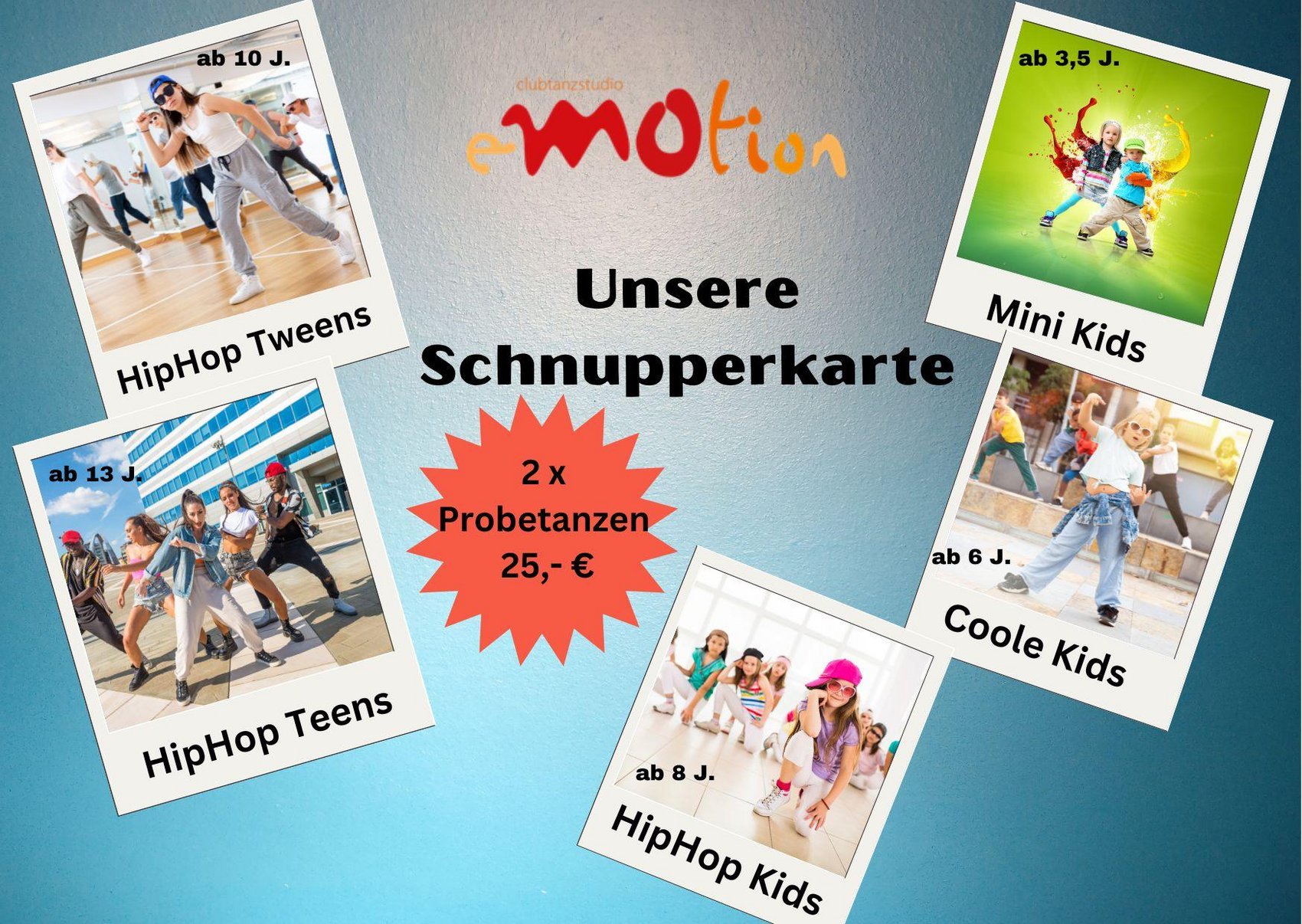 Mit unserer Schnupperkarte ist dies für 14 Tage möglich! Gültig für alle fortlaufenden HipHop und Kindertanzkurse!